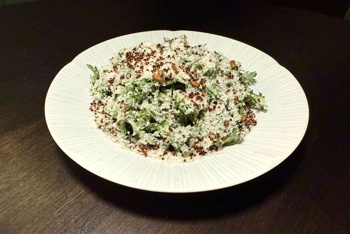 No salad is more resilient than the Caesar, owing as much to its literal sturdiness as the flexibility that allows it to take all sorts of new forms: with kale or little gem, fortified with grilled chicken or salmon, turned into a wrap. The key tenets are creaminess, saltiness, and crunch. When chef Jessica Lee-An was developing a salad for the menu at Sae Ron, a modern Korean restaurant on the Lower East Side, she recalled the piles of chrysanthemum greens that her grandmother would forage from neighbors’ yards in Seoul growing up. Grandma cooked them — in a stew or hot pot, or blanched and dressed as a banchan — but the former Gramercy Tavern pastry chef wanted to represent both her Korean upbringing and American tastes, so her chrysanthemum Caesar salad at Sae Ron is an airy mound of frondlike chrysanthemum greens tossed in a classic anchovy-laced dressing before it’s topped with a snowfall of shaved Parmigiano-Reggiano and crumbles of toasted black quinoa and fried sunflower seeds. “It’s very herbaceous and refreshing — it’s almost like eating parsley crossed with a hint of cilantro with grassy and peppery notes,” Lee-An says.