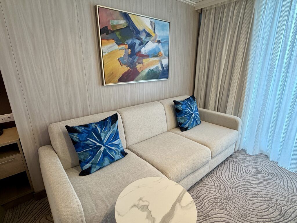 The sitting area includes a sofa that was a comfortable spot for us to unwind during the afternoon or enjoy some room service breakfast. Though, there is no coffee table–only one small side table.