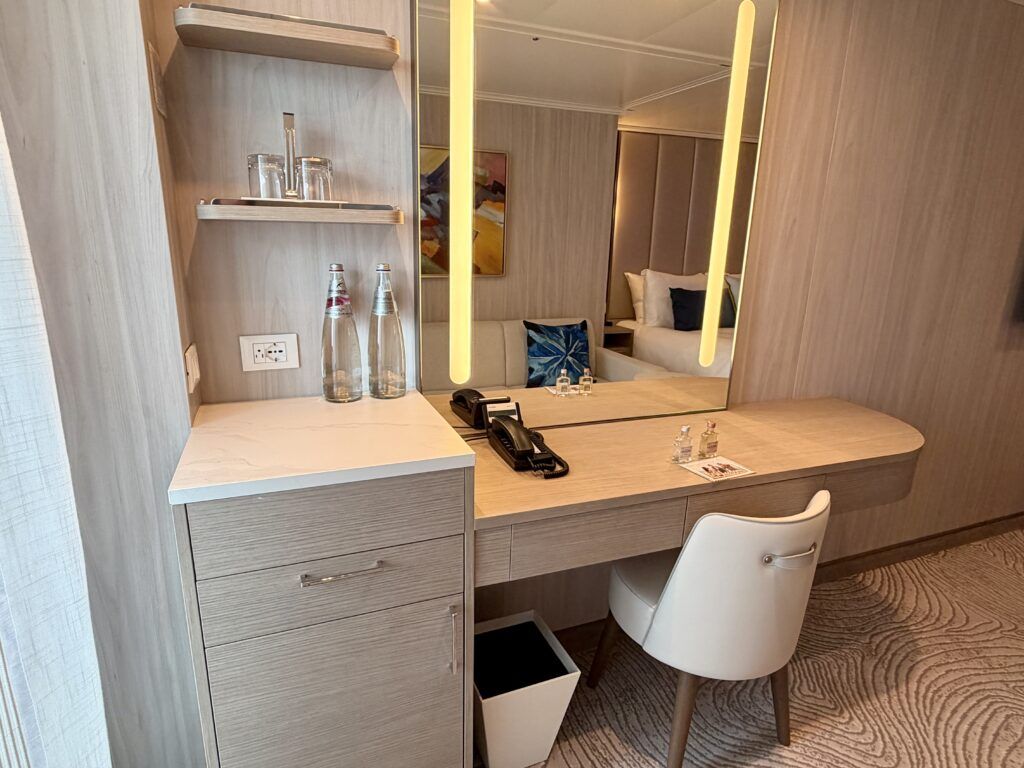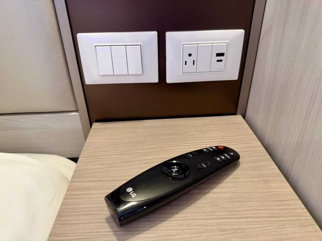 There are small nightstands on each side of the bed for some additional storage, along with one USB, one USB-C, and one US outlet on each side. Across from the bed is the television. We appreciated the outlets near the bed for charging our phones at night—one thing many cruise ships still lack.