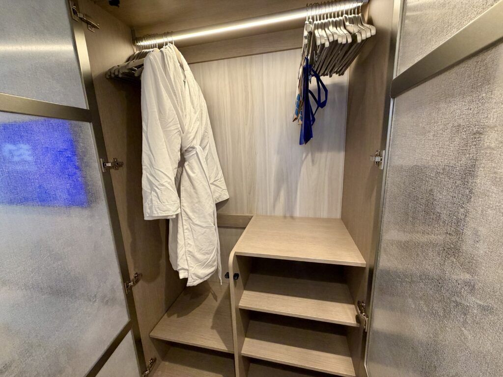The closet in this stateroom offered more than sufficient storage for our 3-day cruise. The full closet features a full-length clothes bar, with half of the space perfect for hanging longer dresses and pants. The other half has four shelves perfect for store packing cubes with undergarments or shoes.