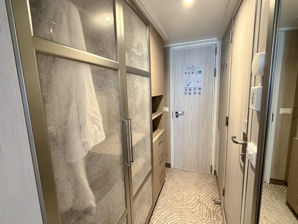 Immediately entering our Star Princess balcony room, the bathroom was to the left. Across from the bathroom was a full closet providing ample storage, along with an additional storage area with shelves and drawers.