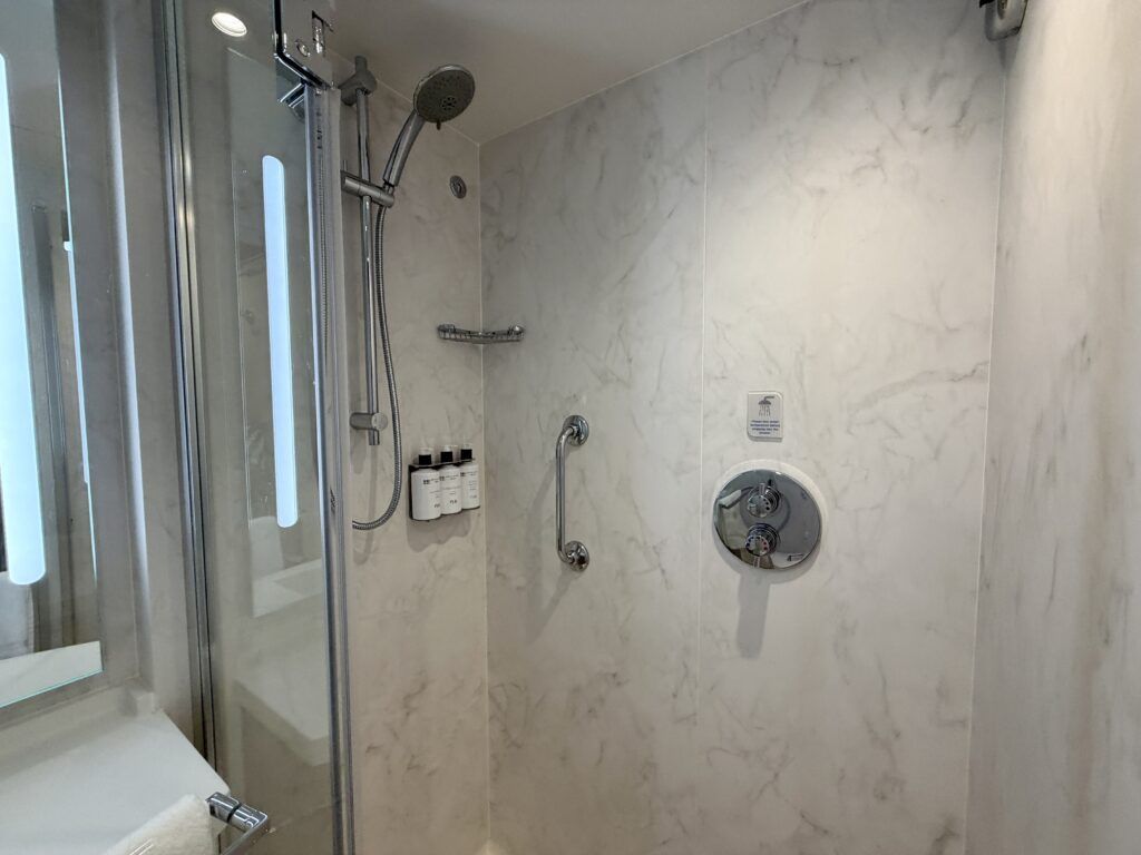 The shower, while featuring a glass door and marble finishes, is still a tad narrow. Though, it does include standard amenities with shampoo, conditioner, and shower gel dispensers.