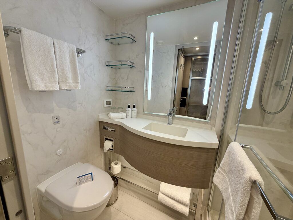 The bathroom in this Star Princess balcony room is a welcomed upgrade. It’s more spacious than typical cruise ship bathrooms and features a glass shower door instead of the dreaded shower curtain still found on many Princess ships.
