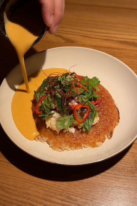 That’s not to suggest that Kiko is a new-look Hooters. Though the menu caroms a little widely for my taste — Italianate mafaldine with mushrooms, even with the twist of fermented black beans, didn’t make much sense — there’s clearly sophistication and tact exercised here. (It’s been a while since I’ve been to a Hooters, but I don’t recall it making its own gently wobbling silken tofu.) It’s more that Chang flexes his finesse in ways that don’t insist upon attention being paid. Thai-style red curry poured over a little hillock of lightly fried lobster crispy rice is plenty flavorful, but it doesn’t demand reverence; you don’t even need to pause your conversation. I spied a whole-fried black bass sitting up and staring the two women who ordered it dead in the face. They continued chatting merrily.