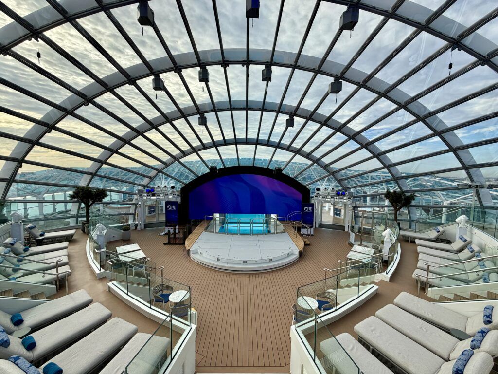 One of the innovative features of the outdoor spaces is found further forward. The Dome is an air-conditioned solarium. With comfy loungers and live entertainment, it is an excellent escape from the Caribbean heat. Later in the day, the Cascade Bar serves up signature cocktails you won’t want to pass up.