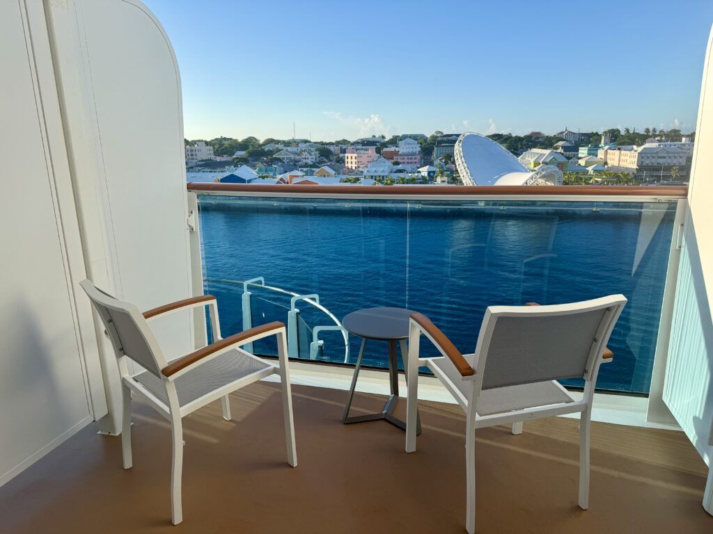 The balcony, too, was larger than expected at around 35 square feet and featured two chairs and a small table. Thus, we had plenty of room to enjoy the ocean views.