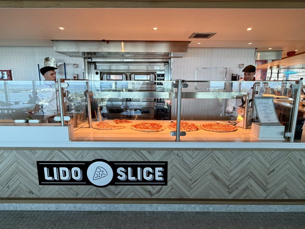 With the buffet now in the middle of the ship, up on the pool deck are quick grab-and-go stations. This includes Lido Slice, cutting up pizza that outshines the competition.