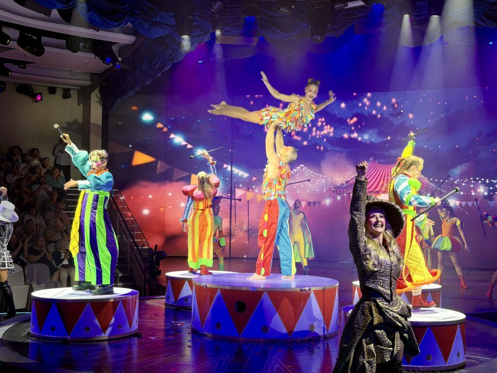 The other new show in the Arena is Illuminate: A Spectacle of Joy. With a more slimmed-down set than Meridian, this circus-themed show featured an aerialist duo/strength performers, several singing and dancing numbers, and plenty of clowns. This 45-minute production is on par with what you would find on other cruise lines, but nothing innovative.